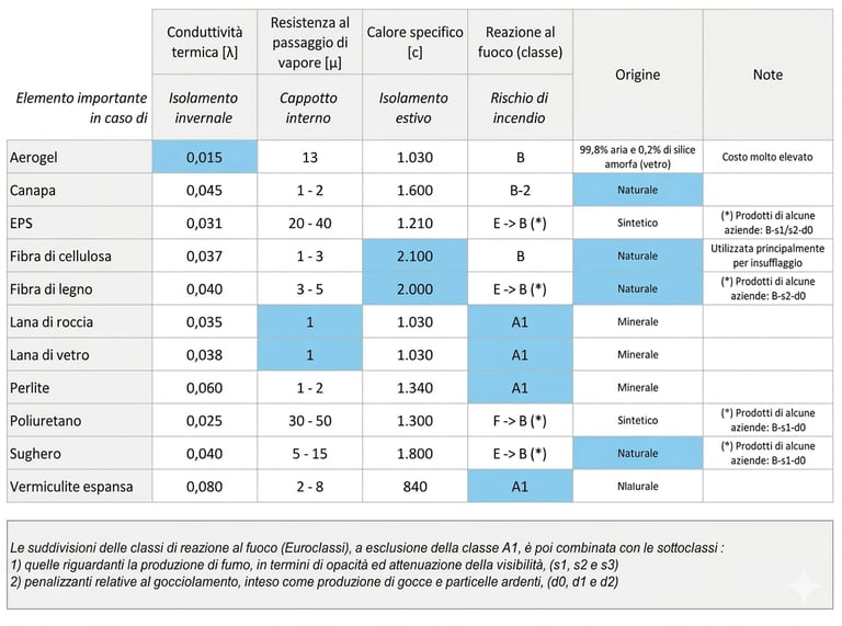 Ci sono vari sistemi e prodotti per coibentare un edificio, cioè proteggerlo dal caldo e/o dal freddo. Nella tabella in basso i materiali più utilizzati e le loro proprietà chimico-fisiche.